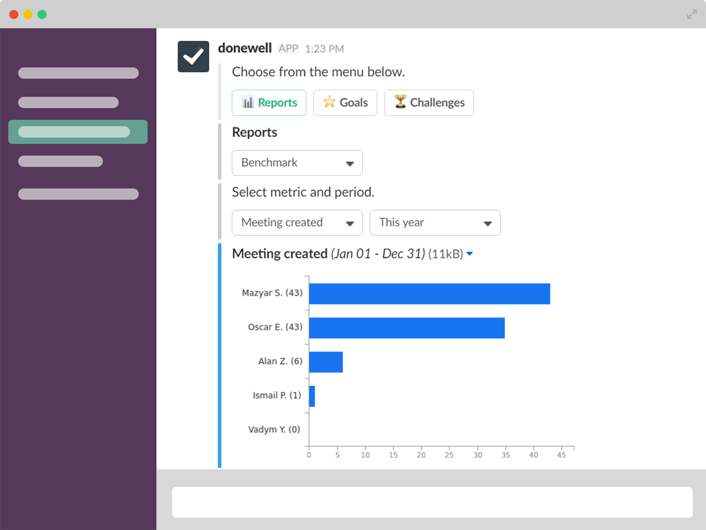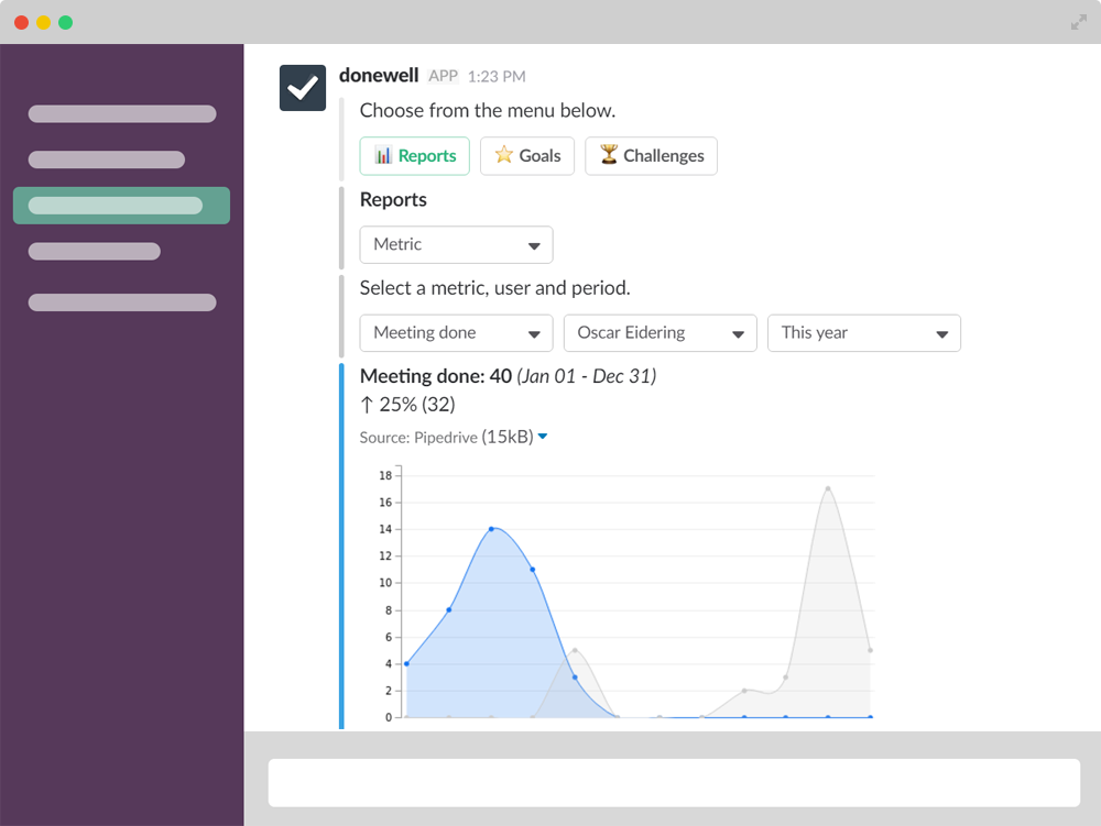 Access powerful sales features in the team communications app your team already uses. No need to implement and learn new apps, workflows or TV dashboards. The Donewell bot can interact with your sales team in Slack via simple commands or scheduled notifications to any channel or user.